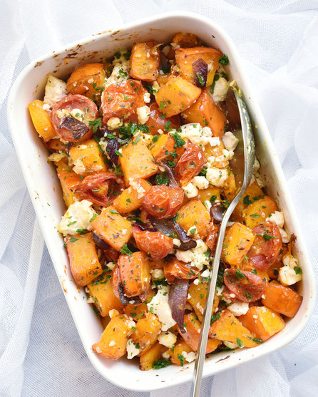 Kürbis-Ofengemüse mit Zwiebeln, Feta und Tomaten z.B. aus dem Airfryer (perfekte Resteverwertung!!)