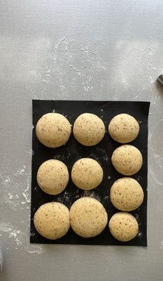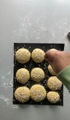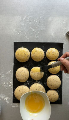 Nach der Gehzeit die Brötchen mit dem Ei bestreichen (alternativ Sojamilch nehmen) und z.B. mit einer Mischung aus Haferflocken und Leinsamen bestreuen.