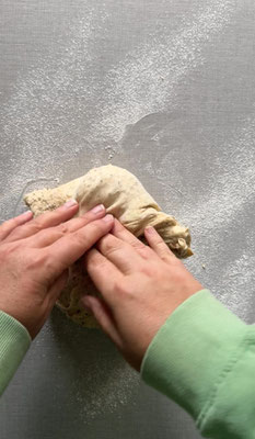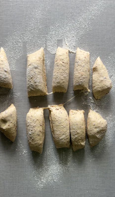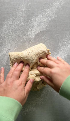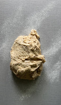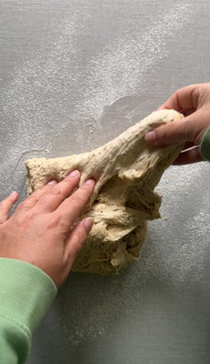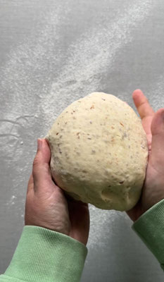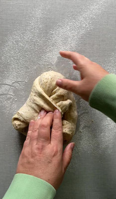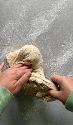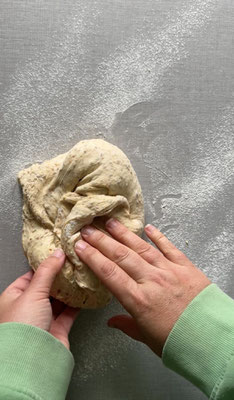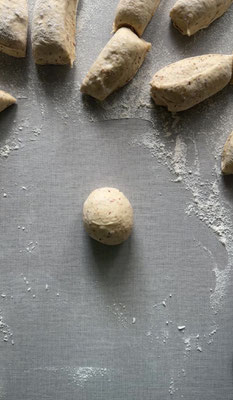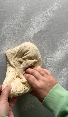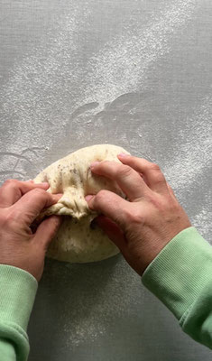 Den Teig mit bemehlten Händen aus dem Mixtopf nehmen und einmal rundum falten, bis der Teig rund ist, um das Glutengerüst zu stabilisieren. Wenn man das macht, wird Teig übrigens auch weniger klebrig. Den Teig dann in 10 Teile teilen.
