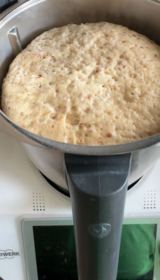 Den Teig abgedeckt z.B. im Mixtopf gehen lassen, bis der Teig doppelt aufgegangen ist. Ca. 1 Std bei guter Raumtemperatur.