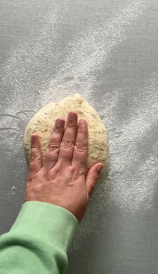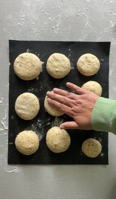 Die Teiglinge flach drücken. Anschließend nochmal ca. 30-60 Min. unter einem Handtuch gehen lassen.