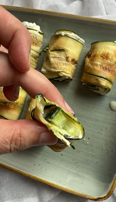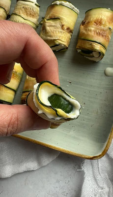 Ich hatte eine Idee für ein Fingerfood im Kopf - ich wollte etwas, das hübsch aussieht, u.a. im Airfryer gemacht werden kann und vor allem lecker ist. Nur Zucchini mit einer Creme zu füllen wäre kein leckeres Fingerfood, es musste in die Mitte etwas Knackiges, damit es Biss hat und nicht nur aus Creme besteht. Eine Tomate lässt sich schwieriger durchbeißen, also habe ich mich für Gurke entschieden! Das lässt sich alles gut und schnell aufrollen und man hat im Handumdrehen ein leckeres Fingerfood!