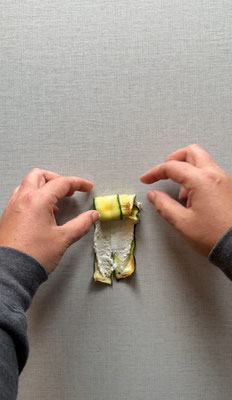 Die halbe Gurkenscheibe oben auf die Streifen legen und von dort aus bis nach unten aufrollen.