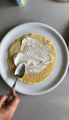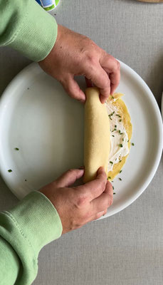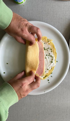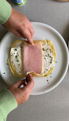 Die Seiten des Pfannkuchen über Käse und Kochschinken klappen und einrollen.