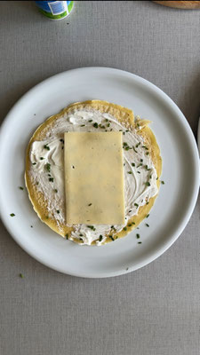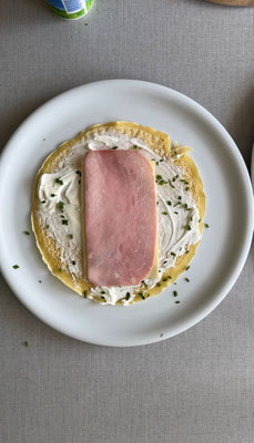 Jeden Pfannkuchen erst mit 1 EL Schmand bestreichen, ggf. leicht salzen, anschließend mit Schnittlauch bestreuen, die Käsescheiben mittig drauf legen, den Kochschicken oben auflegen.