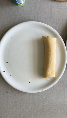 1 TL Schmand jeweils auf die Rollen streichen und geriebenen Käse drauf geben und leicht festdrücken.